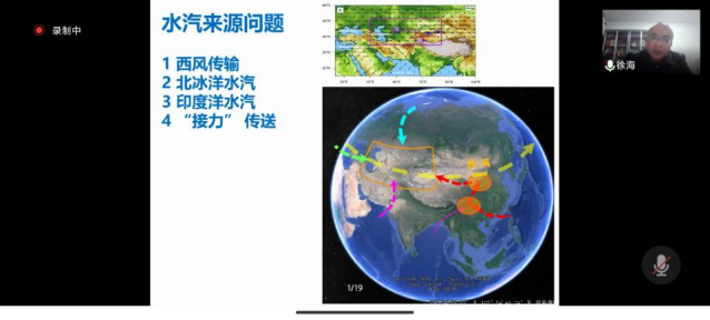 徐海教授从研究亚洲内陆干旱区全新世的水文气候模态及机制的意义和研究方法开始,强调研究亚洲内陆干旱区全新世水文气候模态及机制的重要性;并对亚洲内陆水汽来源的四个假设:“西风传输”、“北冰洋水汽”、“印度洋水汽”和“‘接力’传送”进行说明;最后徐教授结合自己在亚洲内陆干旱区湖泊的大量工作对亚洲内陆干旱区全新世可能的水文气候模态和机制提出假设,并进行总结归纳。
