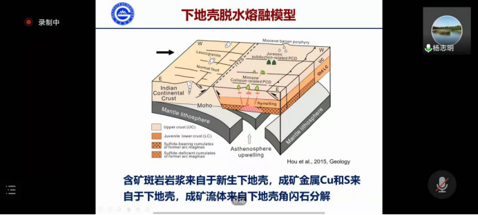 杨志明研究员从超钾质岩和斑岩铜矿成因联系出发,结合冈底斯驱龙矿区研究成果,提出下地壳脱水熔融模型,同时取得以下主要进展:(1)超钾质岩异常富集的性质继承自地幔源区;(2)超钾质岩浆注入下地壳会抬升其氧逸度,促使硫化物转化成硫酸盐,进而是Cu等金属在部分熔融过程中进入熔体;并且认为后碰撞阶段以超钾质岩浆作用,起到与板片俯冲脱水诱发源区熔融类似作用。