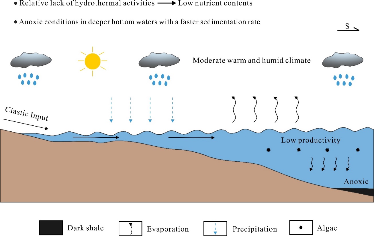 运城盆地崔庄组页岩有机质富集的古环境和沉积条件示意图