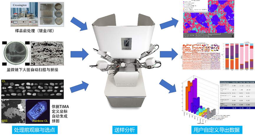 TIMA实验室通过各个硬件模块的深度融合,结合全自动矿物分析系统软件的智能识别,具备有超高速分析效率,能够高效获取样品的矿物组成及含量、矿物解离与连生关系、颗粒形态、大小及分布关系以及元素与孔隙的相关基础信息。通过各模块智能联用,该套系统可实现从样品处理前观察及选点到送样分析再到最后的数据处理与导出的一体化全自动综合矿物分析;