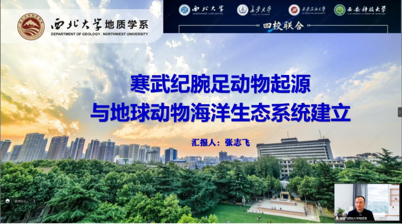 西北大学地质学系主任张志飞教授为大家作《寒武纪腕足动物起源与地球动物海洋生态系统建立》报告,报告内容主要为以下三个方面:1.地球生态系统的划分与宜居性演化;2.寒武纪腕足动物生活方式和生态工程;3.寒武纪腕足动物起源与苔藓动物的发现。张教授鼓励青年学生要善于思考、敢于突破、静心研究,争取获得突破性的原创成果,以实际行动支撑我国科学技术的发展。