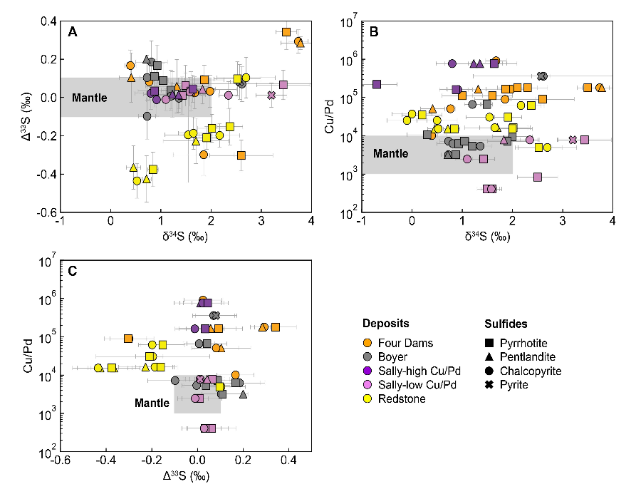 针对这些科学问题,马修教授领衔的国际铜镍硫化物矿床研究团队通过分析北美最大的Coldwell碱性杂岩体东部辉长岩套(图1)中Cu-Ni-PGE 矿床群的的硫同位素组成(δ³⁴S和Δ³³S)以及全岩Cu/Pd比值,发现(图2):北部矿床的δ³⁴S值(-0.7‰至3.78‰)和Δ³³S值(-0.44‰至0.34‰)显著偏离地幔范围(δ³⁴S=0±2‰,Δ³³S=0±0.1‰)。据此,研究团队提出,(1)北部矿床群中的硫有约20%来自太古代地壳,硫化物经过多期次分离与PGE(铂族元素)动态再富集;(2)东部Marathon 矿床硫源均来自地幔,深部没有出现硫化物熔离,岩浆快速上升导致地壳混染极弱(图3)。本次研究为岩浆通道型矿床中硫同位素的分馏机制及PGE成矿动力学提供了新视角。