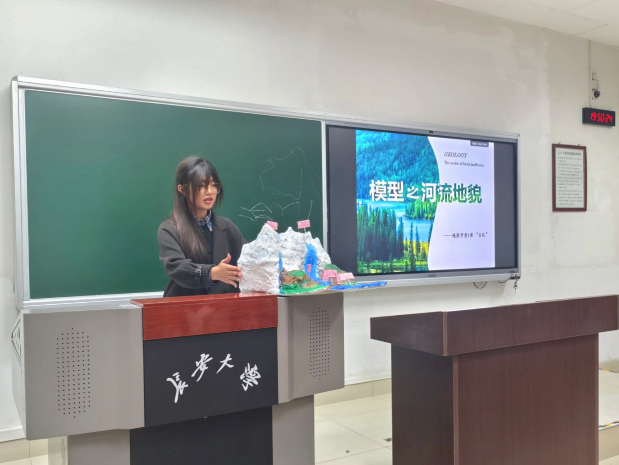 在主持人宣布比赛规则后,参赛队伍依次上台以PPT讲解的形式,重点介绍了模型制作原因、模型地质知识和收获与感悟等内容。参赛选手制作的地质模型有,海岸地貌、河流地貌、冰川地貌、地球圈层结构和喜马拉雅山隆升等,充分展现了参赛选手的专业能力及创造力;在讲解的同时,也为观众科普了大量地学知识。