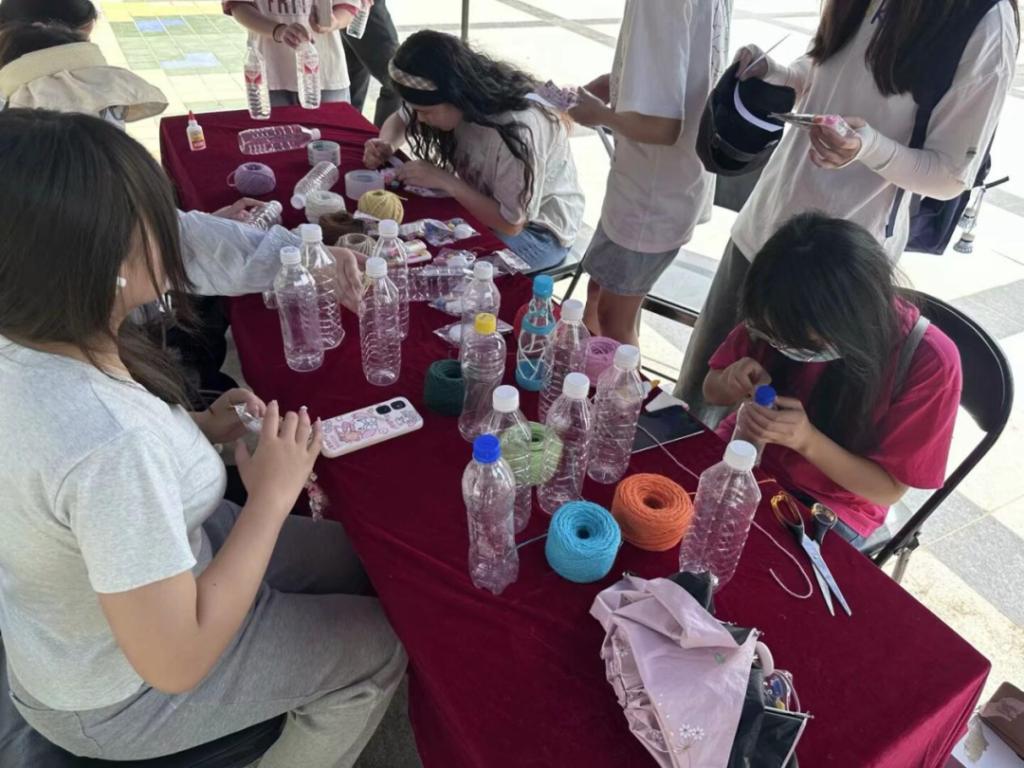 在环保手工制作体验区,同学们积极参与“变废为宝”创意活动。大家利用收集来的废弃塑料瓶和彩色毛线等,在志愿者指导下制作出各种精美的手工艺品。在石膏娃娃绘画区,同学们发挥艺术创意,在白色石膏模型上描绘出五彩斑斓的图案。