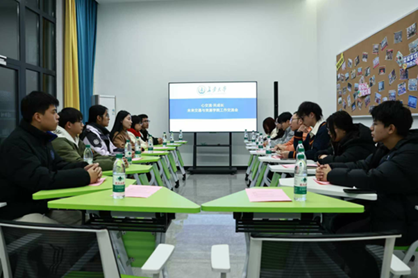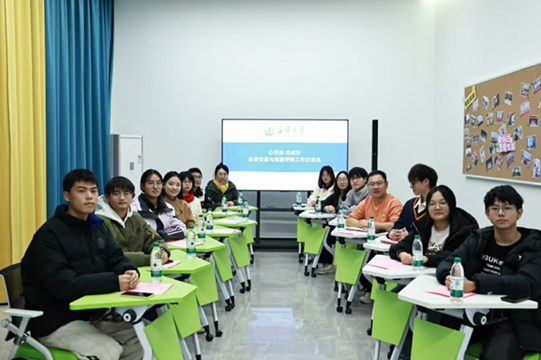 学办主任黎皛、彩虹心理协会指导老师张凤、未来交通学院彩虹心理协会指导老师刘志兴以及双方协会成员。工作交流会由未来交通学院彩虹心理协会主席李鑫澳主持,“遇见心理学家”沙龙活动由未来交通学院韩培森主持。