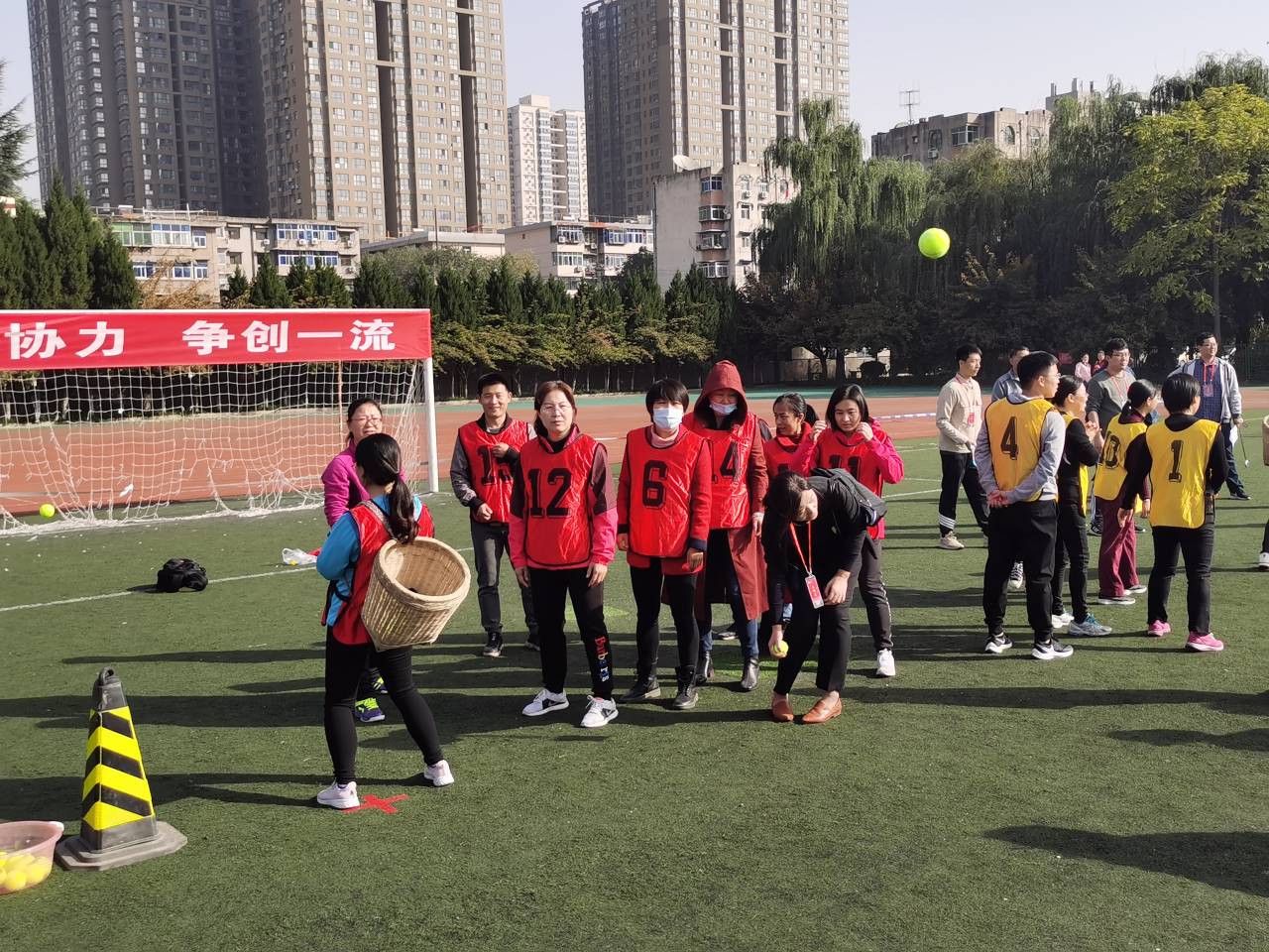 教职工参赛队员在双人夹球接力赛中同心协作、奋勇向前,背篓接球大丰收项目中一扔一接、巧妙配合,车轮滚滚趣味接力赛中团结有序、齐心协力、稳步前行。